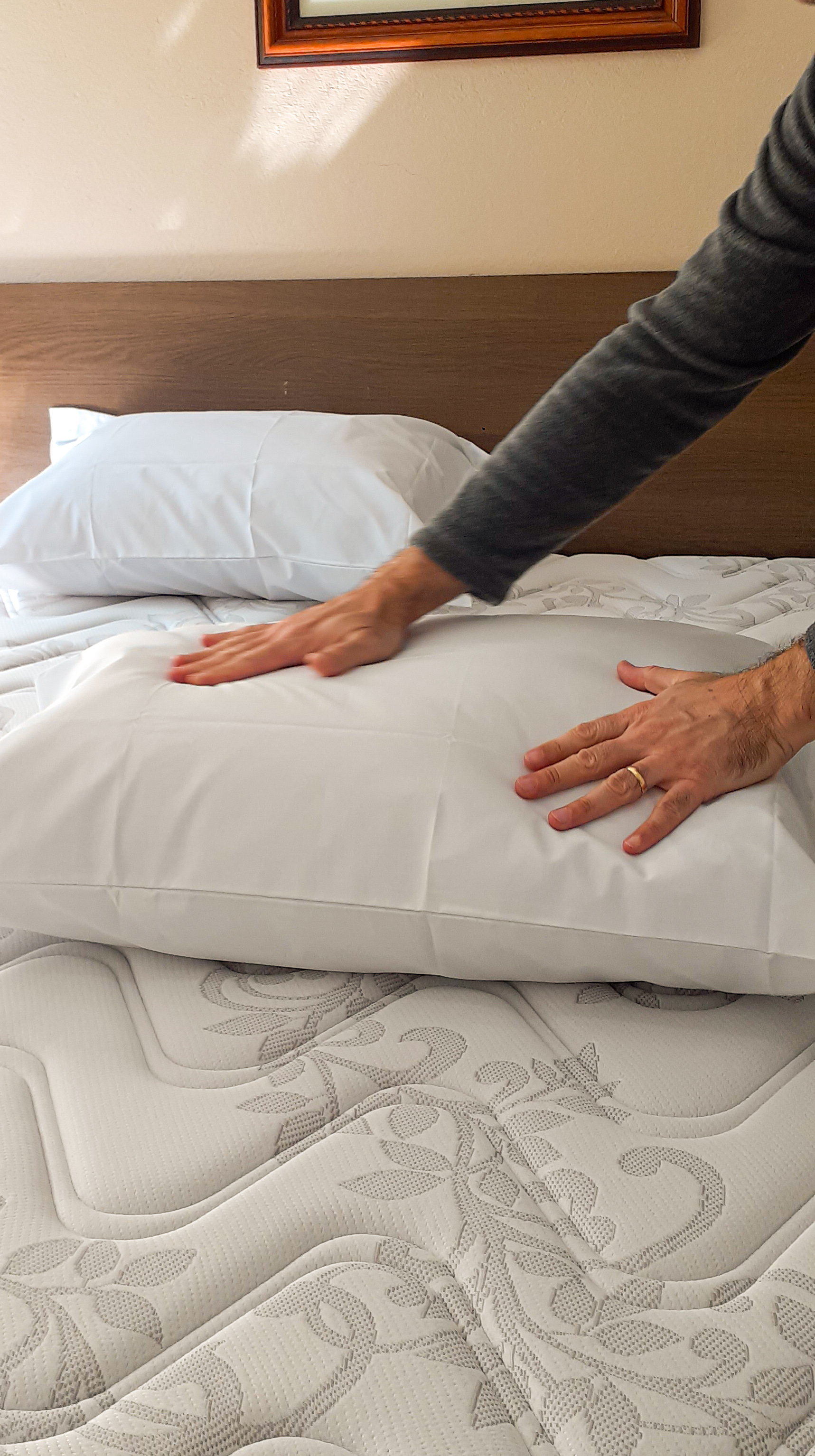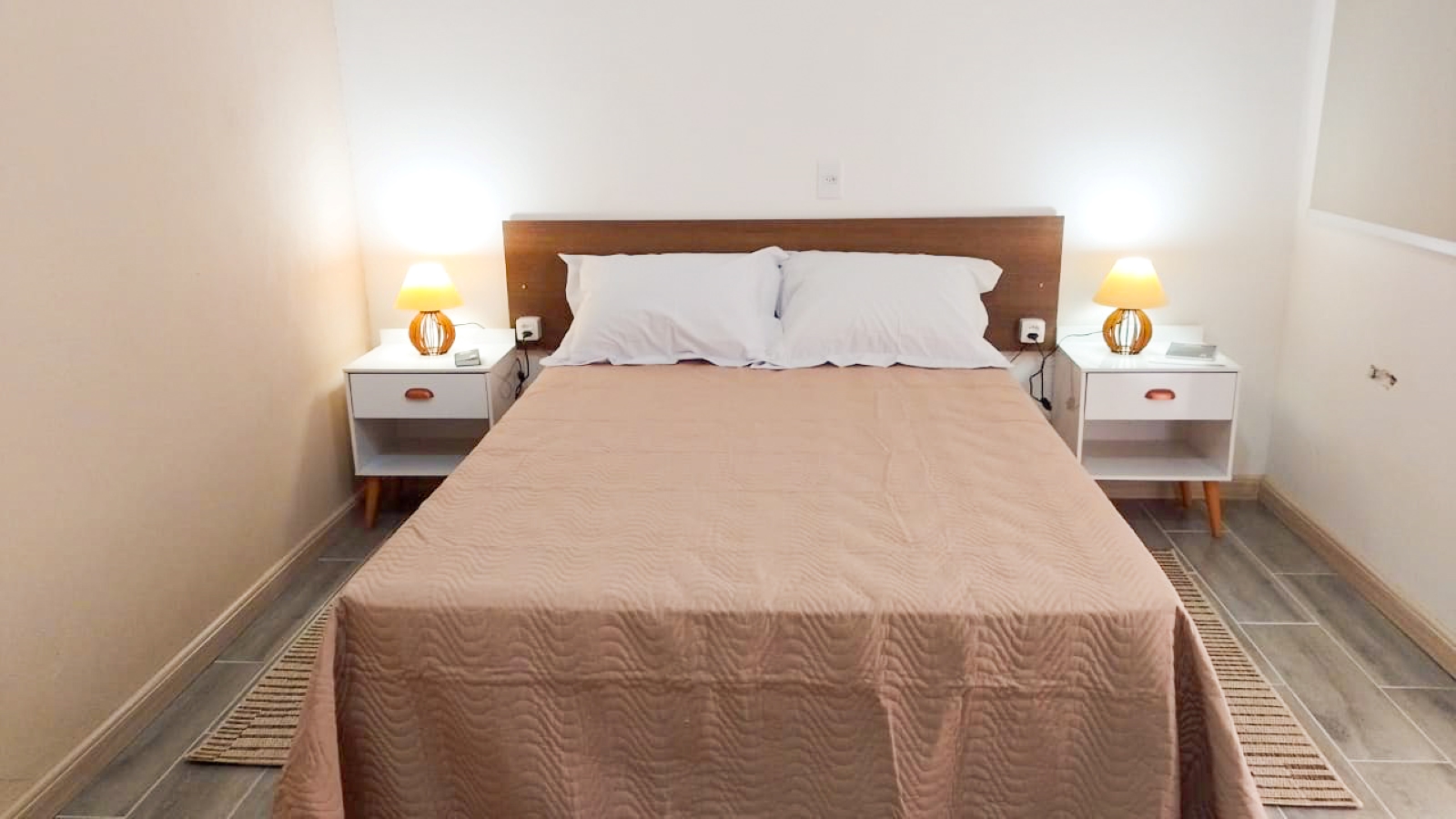 Quartos completos com enxoval de excelente qualidade, banheiro privativo, escrivaninha, roupeiro, wi-fi e TV com canais digitais e streaming.